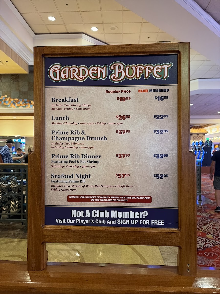“ One of the only cheap Casino Buffets left. The variety is spot on actually featuring a nice spread. I particularly enjoyed the Pot Stickers and Tortellini specifically with Bolognese Sauce. Most of the food was stirred every once in awhile by the chefs to make sure that all the flavors and aspects of the dish were easy to obtain. Admittedly, the fish was pretty dry and the cheese on the Cordon Bleu was harder to chew comparatively to how good the actual chicken beneath it tasted. The glass above the food is close to it and so I had to smush my face against it to grab some of the food behind. Also, it didn't make sense for dessert toppings, soups, specials, and shrimp to be under the general category of salad when looking above. Service was really nice and we never ran out of drinks nor did we get overflowed with dishes. The wirkers at the counter were equally very nice and personable. Though it seemed pretty hot in the casino in general. I still enjoyed my time here thoroughly and would genuinely come back when I'm craving a buffet. ”